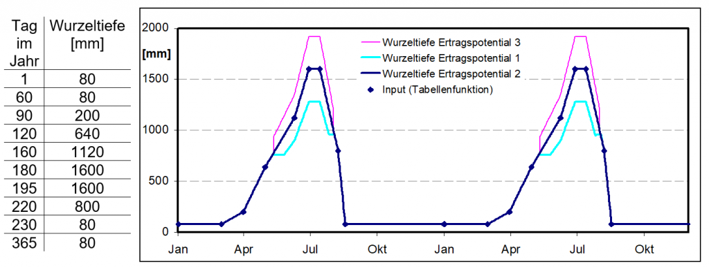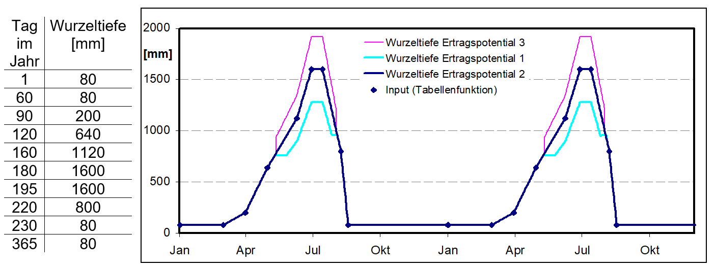 Abb. 4‑3: Tabellenfunktion zur Beschreibung des mittleren innerjährlichen Ganges der Wurzelentwicklung auf Ackerflächen und interne Umsetzung im Modell bei Berücksichtigung des Ertragspotentials des Bodens