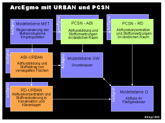 Abb. 1: Das Modul URBAN und PCSN im Rahmen des hydrologischen Einzugsgebietsmodells ArcEGMO
